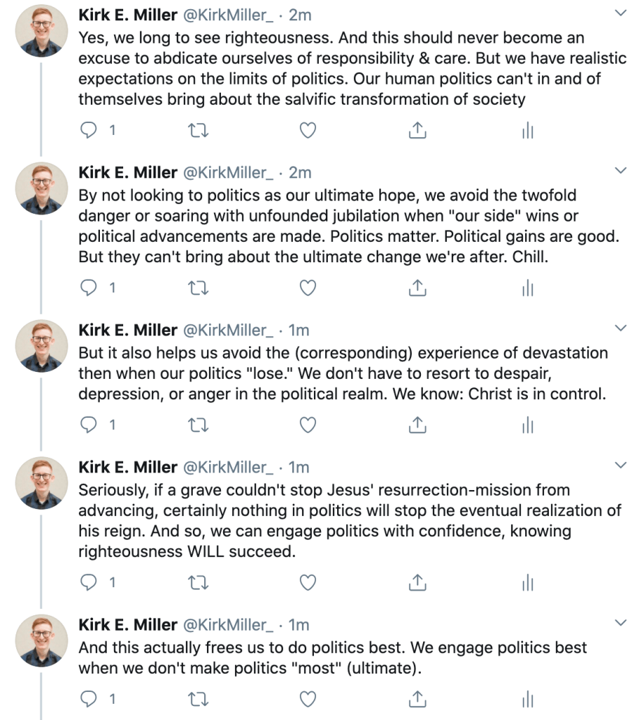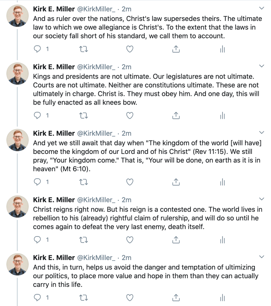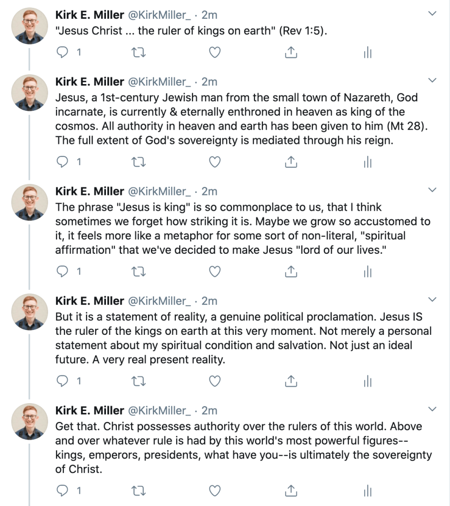 “Jesus is King” & Our Engagement of Politics September 16, 2020September 16, 2020Kirk E. Miller See full Tweet thread: "Jesus Christ … the ruler of kings on earth" (Rev 1:5).— Kirk E. Miller (@KirkMiller_) September 16, 2020 Discover more from Kirk E. Miller Subscribe to get the latest posts sent to your email. Type your email… Subscribe Share this! Click to share on Facebook (Opens in new window) Facebook Click to share on X (Opens in new window) X Click to share on LinkedIn (Opens in new window) LinkedIn Click to share on Tumblr (Opens in new window) Tumblr Click to share on Reddit (Opens in new window) Reddit Click to share on WhatsApp (Opens in new window) WhatsApp Click to share on Pinterest (Opens in new window) Pinterest Click to email a link to a friend (Opens in new window) Email Click to print (Opens in new window) Print Like Loading... Related