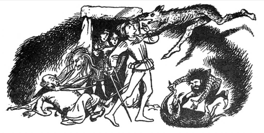 Finding themselves in dire straights, Caspian blows Susan’s magical horn in expectation that it will summon help, either of Aslan himself or the Pevensie children, Peter, Susan, Edmund, and Lucy (pp. 95–96).