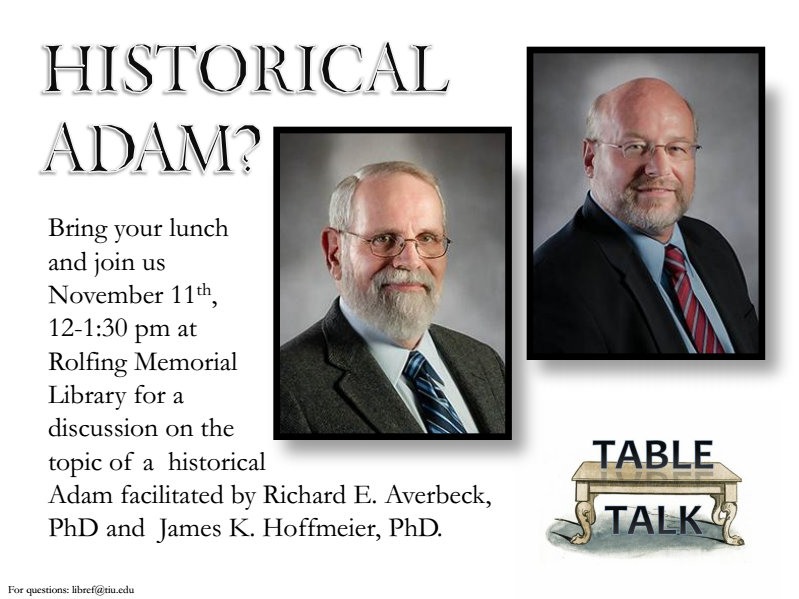 Our second Table Talk event hosted at Rolfing Memorial Library is about less than a week away. This time we will discuss the topic of a historical Adam. The discussion will be facilitated by Dr. Richard E. Averbeck (PhD) and Dr. James K. Hoffmeier (PhD) of Trinity Evangelical Divinity School. Be there!